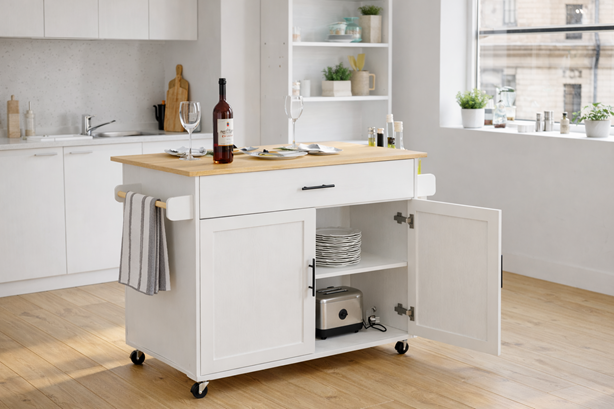 One of its biggest benefits is additional counter space, making cooking and baking more convenient. Many designs also include drawers, cabinets, or open shelves to help keep your kitchen organized. With bar stools, it easily becomes a cozy breakfast or snack area.